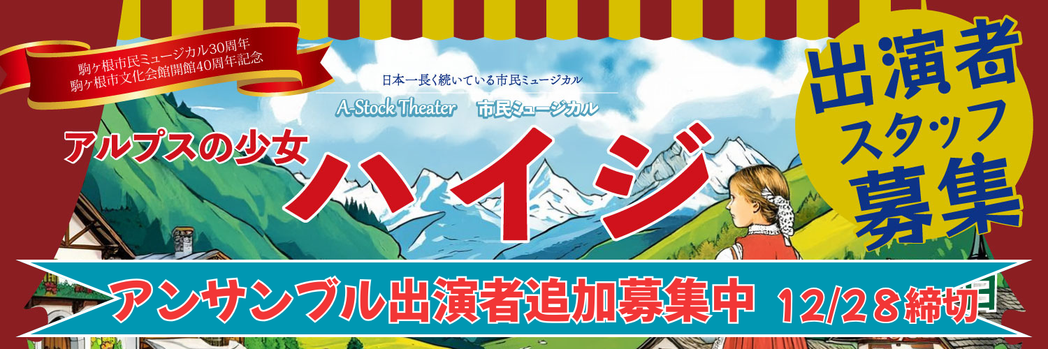 A-Stock Theater市民ミュージカル「アルプスの少女ハイジ」では、アンサンブル出演者の追加募集を行います。 アンサンブルとは、主役を支える役割を担う出演者のことです。 ■ 募集対象 歌やダンスシーンを中心に出演 […]